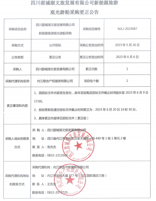四川甜城湖文旅發(fā)展有限公司新能源旅游觀光游船采購更正公告