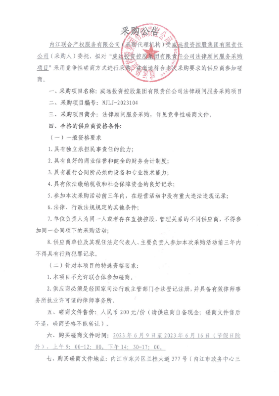 威遠(yuǎn)投資控股集團(tuán)有限責(zé)任公司法律顧問服務(wù)采購(gòu)項(xiàng)目采購(gòu)公告