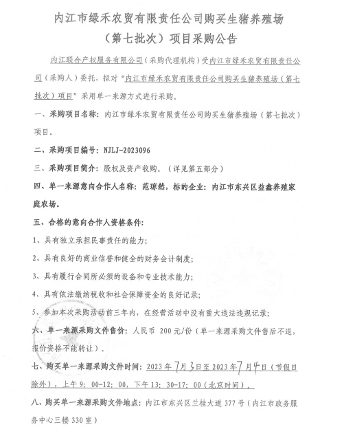 內(nèi)江市綠禾農(nóng)貿(mào)有限責(zé)任公司購買生豬養(yǎng)殖場(第七批次)項(xiàng)目采購公告