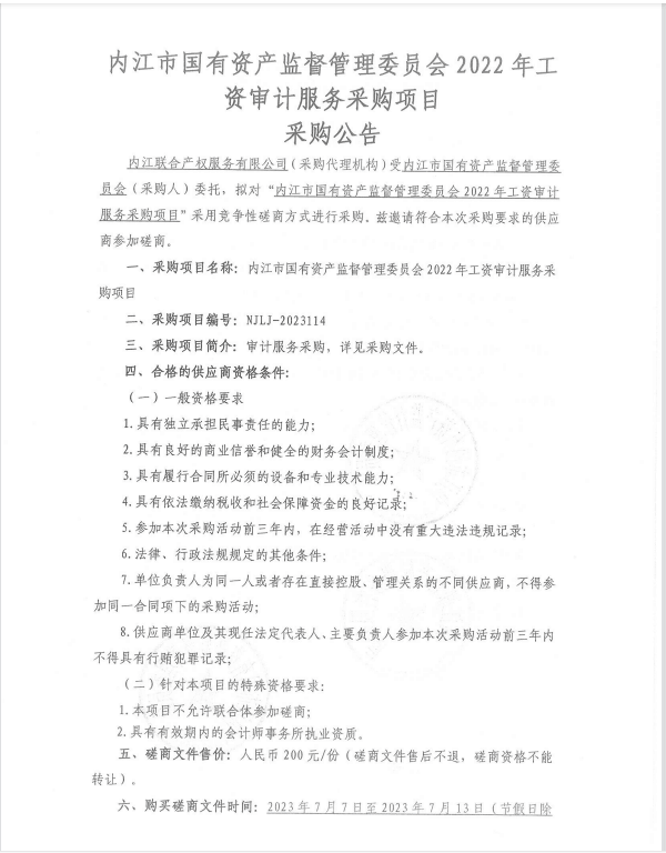內(nèi)江市國有資產(chǎn)監(jiān)督管理委員會2022年工資審計(jì)服務(wù)采購項(xiàng)目采購公告