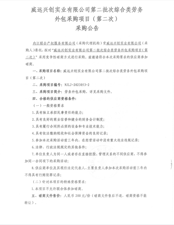 威遠(yuǎn)興創(chuàng)實業(yè)有限公司第二批次綜合類勞務(wù)外包采購項目(第二次)采購公告