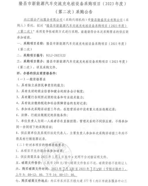 隆昌市新能源汽車交流充電樁設(shè)備采購項(xiàng)目(2023年度) (第二次)采購公告