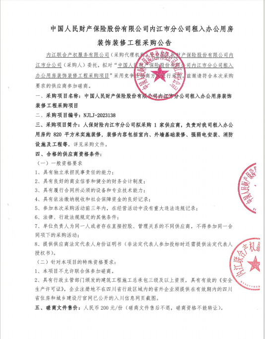 中國人民財(cái)產(chǎn)保險(xiǎn)股份有限公司內(nèi)江市分公司租入辦公用房裝飾裝修工程采購公告