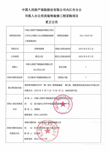 中國人民財產(chǎn)保險股份有限公司內(nèi)江市分公司租入辦公用房裝飾裝修工程采購項目更正公告