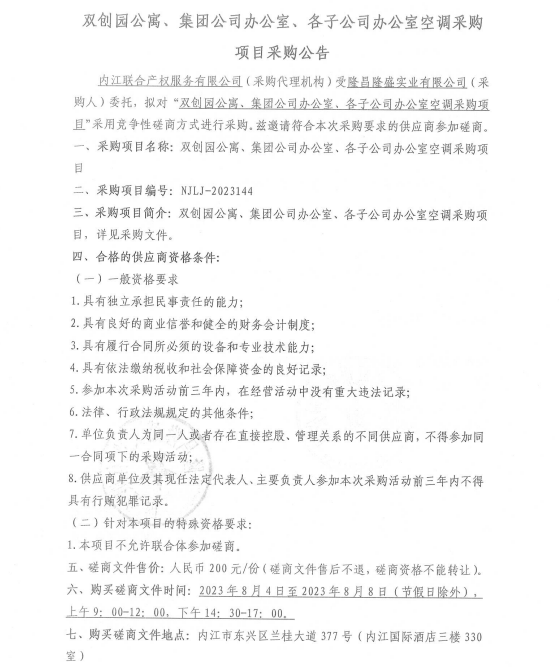 雙創(chuàng)園公寓、集團公司辦公室、各子公司辦公室空調(diào)采購項目采購公告