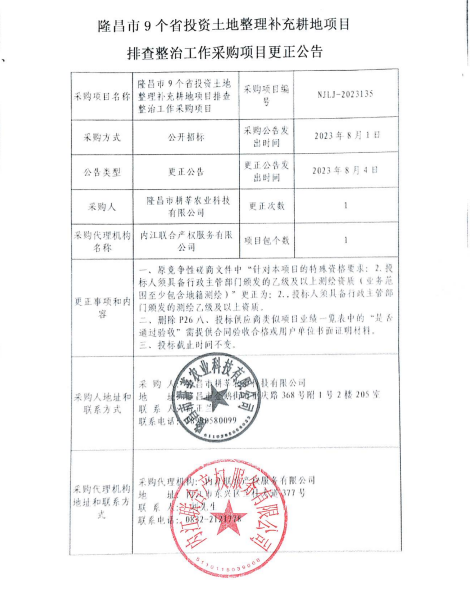 隆昌市9個省投資土地整理補(bǔ)充耕地項目排查整治工作采購項目更正公告