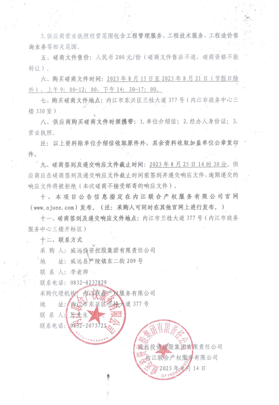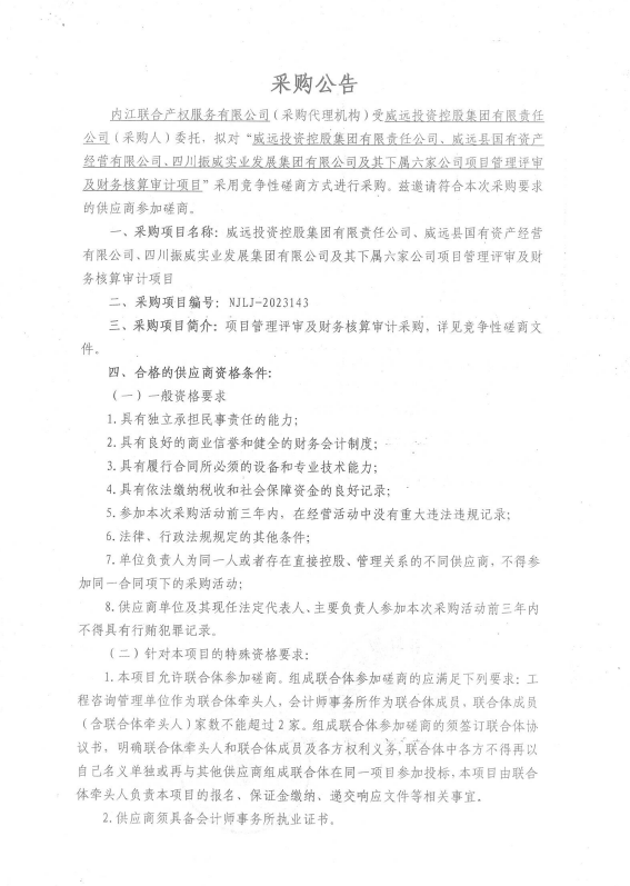 威遠投資控股集團有限責任公司、威遠縣國有資產(chǎn)經(jīng)營有限公司、四川振威實業(yè)發(fā)展集團有限公司及其下屬六家公司項目管理評審及財務核算審計項目采購公告