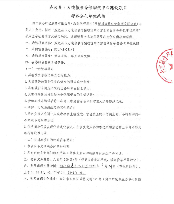 威遠縣3萬噸糧食倉儲物流中心建設項目勞務分包單位采購公告