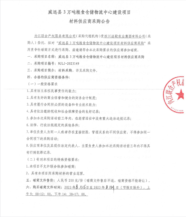 威遠(yuǎn)縣3萬(wàn)噸糧食倉(cāng)儲(chǔ)物流中心建設(shè)項(xiàng)目材料供應(yīng)商采購(gòu)公告