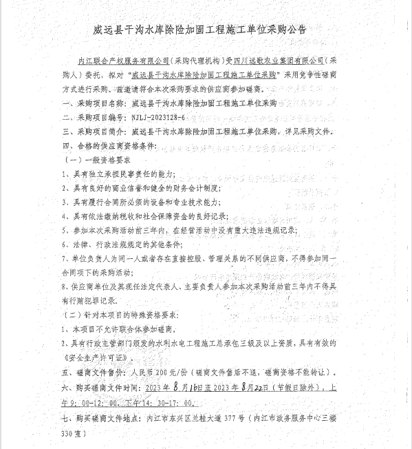 威遠(yuǎn)縣干溝水庫除險加固工程施工單位采購公告