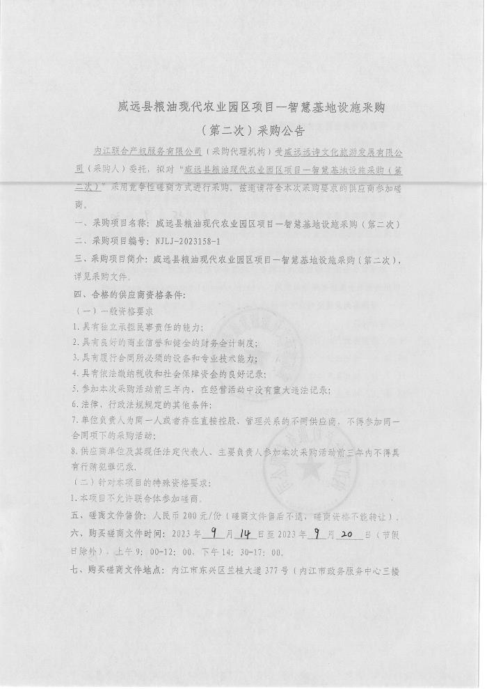 威遠(yuǎn)縣糧油現(xiàn)代農(nóng)業(yè)園區(qū)項(xiàng)目—智慧基地設(shè)施采購(gòu)(第二次)采購(gòu)公告