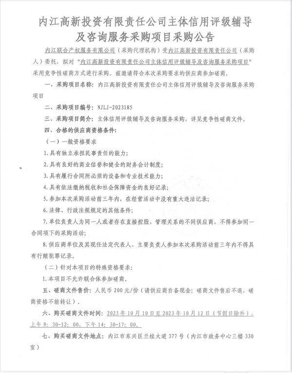 內(nèi)江高新投資有限責(zé)任公司主體信用評級輔導(dǎo)及咨詢服務(wù)采購項目采購公告