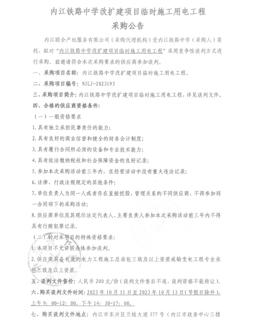 內(nèi)江鐵路中學(xué)改擴建項目臨時施工用電工程采購公告