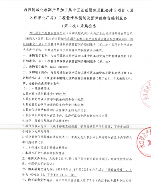 內(nèi)自同城化農(nóng)副產(chǎn)品加工集中區(qū)基礎(chǔ)設(shè)施及配套建設(shè)項目(園區(qū)標準化廠房)工程量清單編制及預算控制價編制服務(wù)(第二次)采購公告