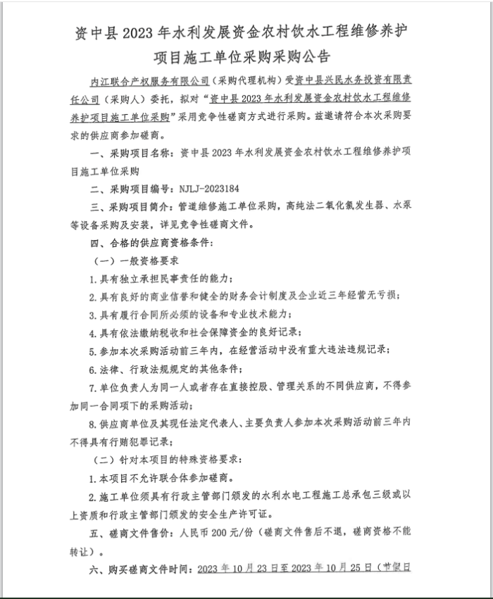 資中縣2023年水利發(fā)展資金農(nóng)村飲水工程維修養(yǎng)護(hù)項目施工單位采購采購公告