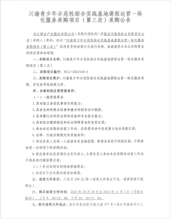 川渝青少年示范性綜合實(shí)踐基地課程運(yùn)營一體化服務(wù)采購項(xiàng)目(第三次)采購公告