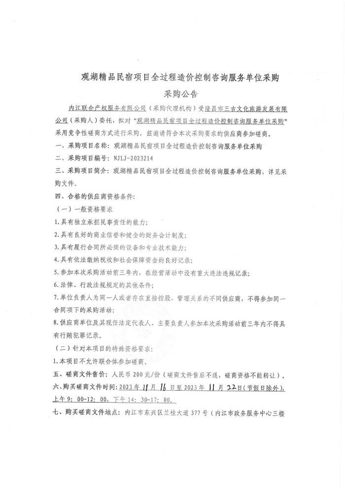 觀湖精品民宿項(xiàng)目全過程造價控制咨詢服務(wù)單位采購采購公告