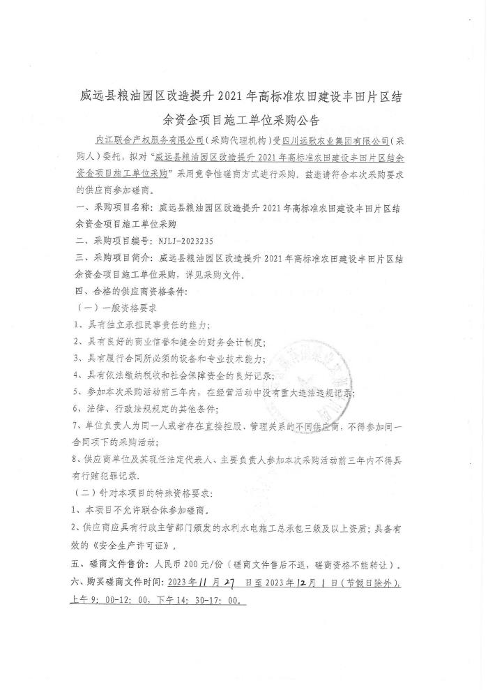 威遠(yuǎn)縣糧油園區(qū)改造提升2021年高標(biāo)準(zhǔn)農(nóng)田建設(shè)豐田片區(qū)結(jié)余資金項(xiàng)目施工單位采購(gòu)公告