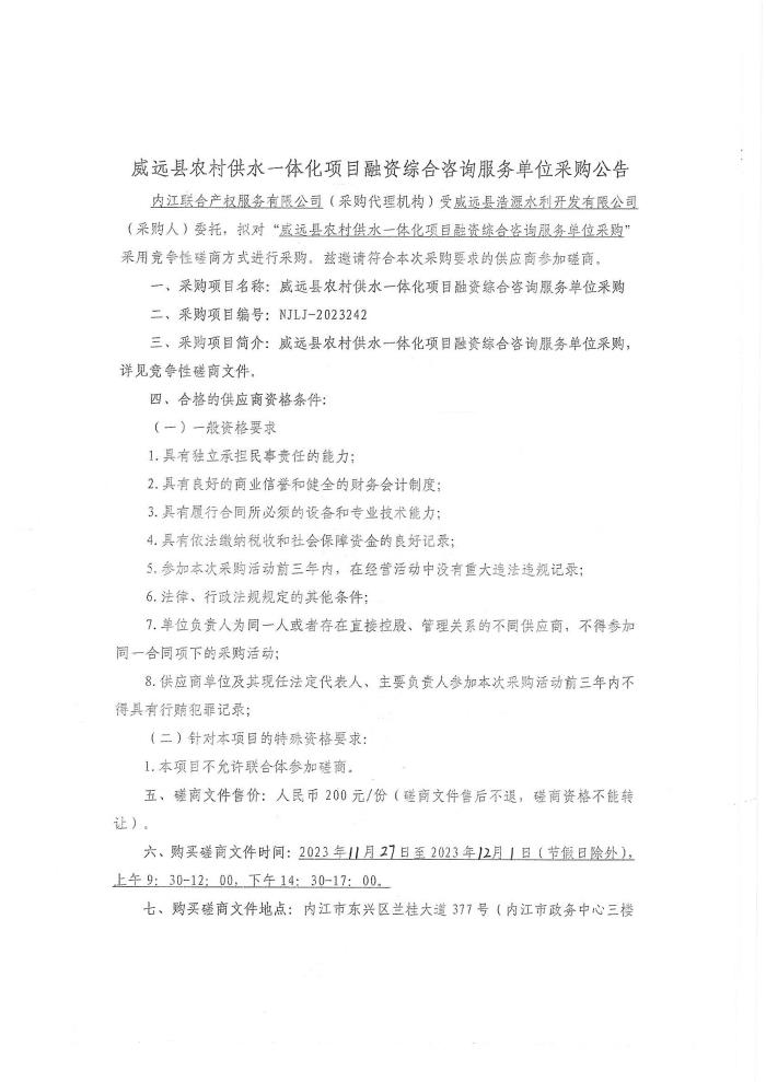 威遠(yuǎn)縣農(nóng)村供水一體化項(xiàng)目融資綜合咨詢服務(wù)單位采購公告