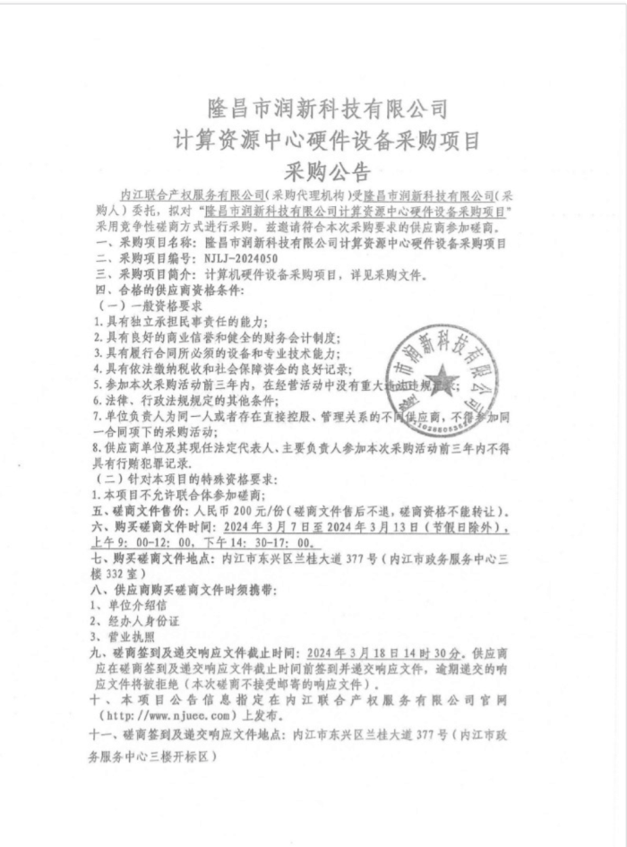 隆昌市潤新科技有限公司計算資源中心硬件設備采購項目采購公告