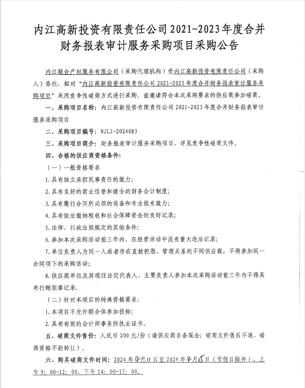 內(nèi)江高新投資有限責(zé)任公司2021-2023年度合并財務(wù)報表審計服務(wù)采購項目采購公告