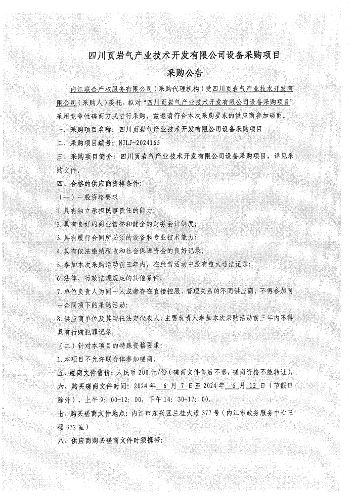 四川頁巖氣產(chǎn)業(yè)技術開發(fā)有限公司設備采購項目采購公告