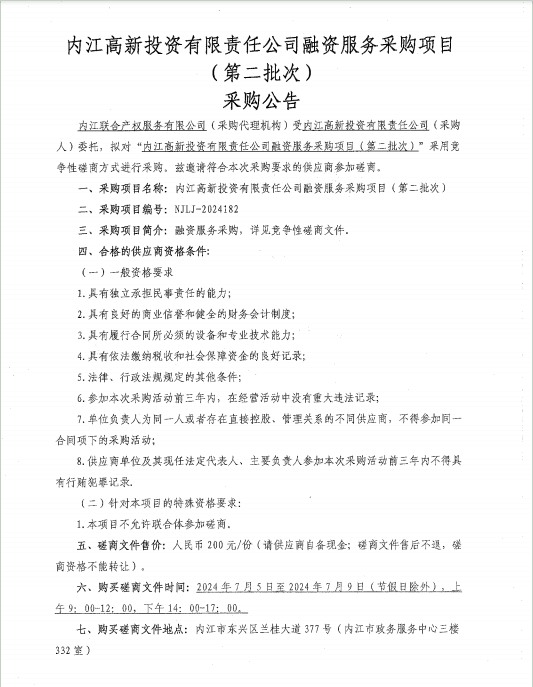 內(nèi)江高新投資有限責(zé)任公司融資服務(wù)采購(gòu)項(xiàng)目(第二批次)采購(gòu)公告