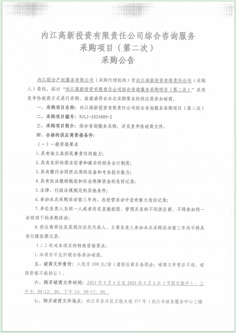 內(nèi)江高新投資有限責(zé)任公司綜合咨詢服務(wù)采購項目(第二次)采購公告