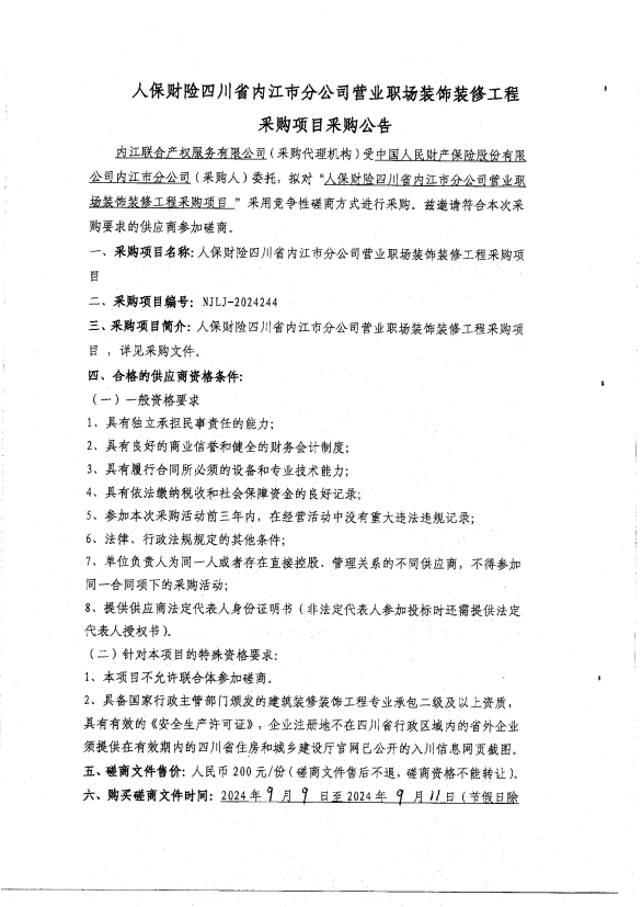 人保財險四川省內(nèi)江市分公司營業(yè)職場裝飾裝修工程采購項目采購公告