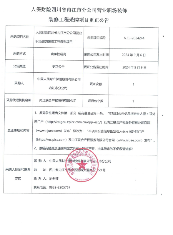 人保財險四川省內江市分公司營業(yè)職場裝飾裝修工程采購項目更正公告