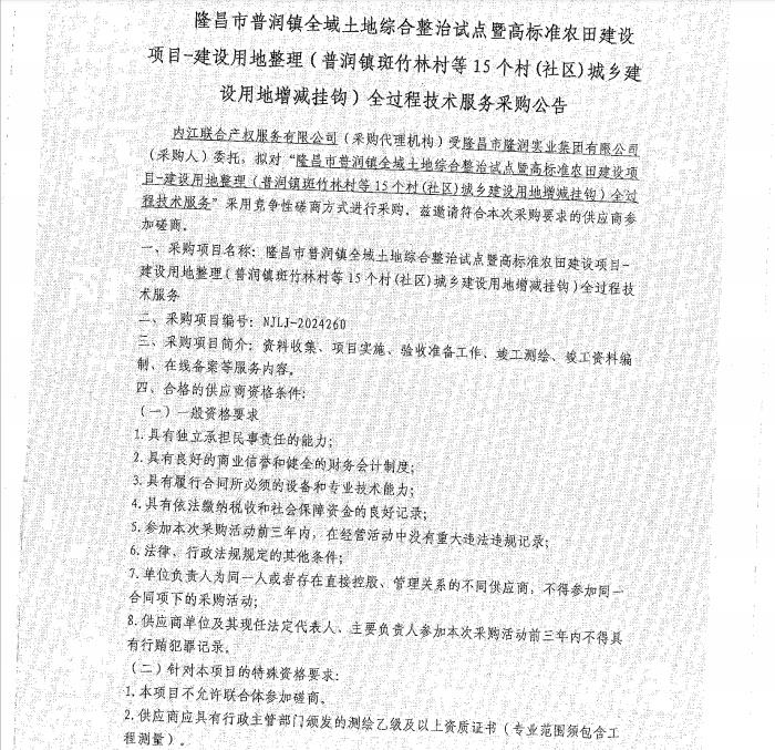 隆昌市普潤鎮(zhèn)全域土地綜合整治試點(diǎn)暨高標(biāo)準(zhǔn)農(nóng)田建設(shè)項(xiàng)目-建設(shè)用地整理(普潤鎮(zhèn)斑竹林村等15個(gè)村(社區(qū))城鄉(xiāng)建設(shè)用地增減掛鉤)全過程技術(shù)服務(wù)采購公告