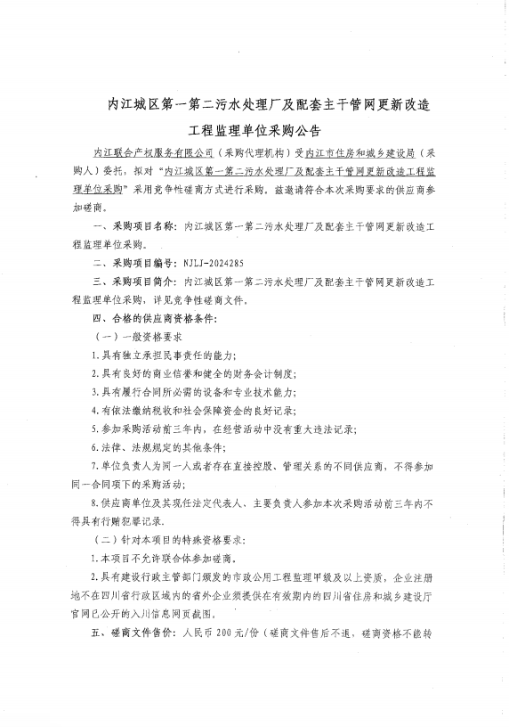 內(nèi)江城區(qū)第一第二污水處理廠及配套主干管網(wǎng)更新改造工程監(jiān)理單位采購公告