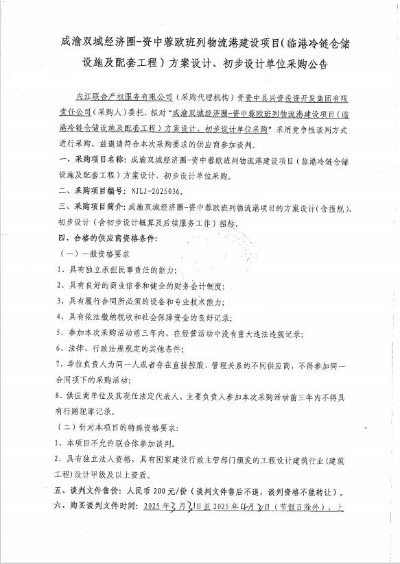 成渝雙城經(jīng)濟(jì)圈-資中蓉歐班列物流港建設(shè)項目(臨港冷鏈倉儲設(shè)施及配套工程)方案設(shè)計、初步設(shè)計單位采購公告