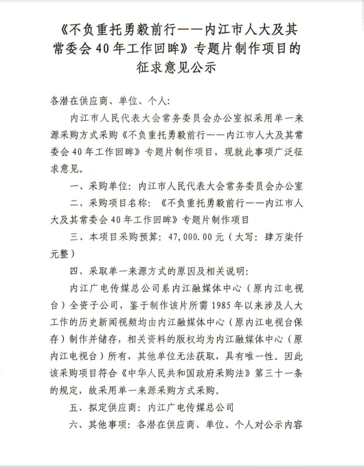 《不負(fù)重托勇毅前行——內(nèi)江市人大及其常委會40年工作回眸》專題片制作項目的征求意見公示