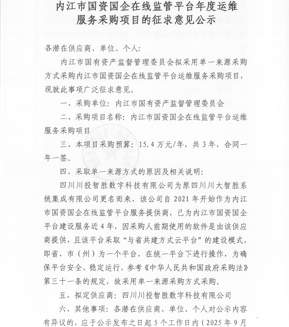 內(nèi)江市國資國企在線監(jiān)管平臺(tái)運(yùn)維服務(wù)采購項(xiàng)目的征求意見公示