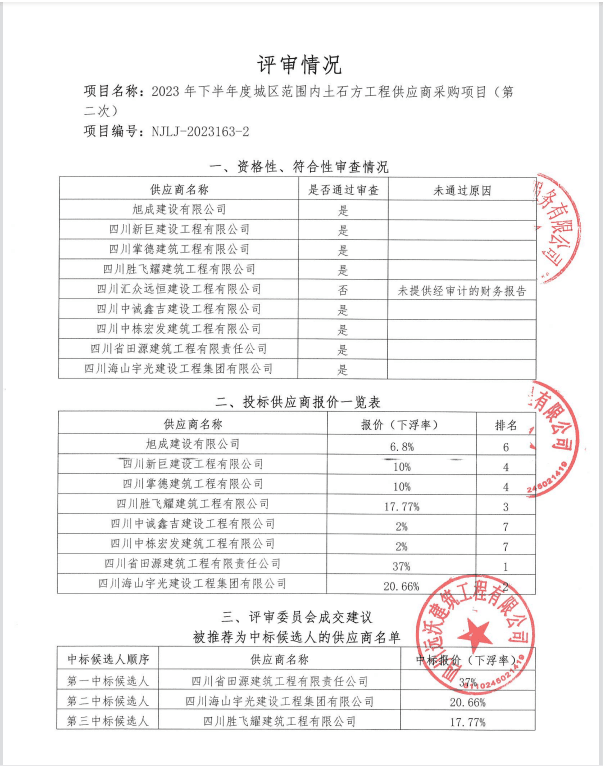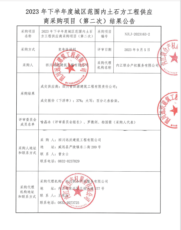 2023年下半年度城區(qū)范圍內(nèi)土石方工程供應(yīng)商采購項(xiàng)目(第二次)結(jié)果公告