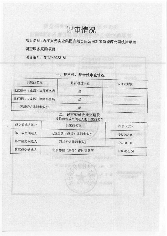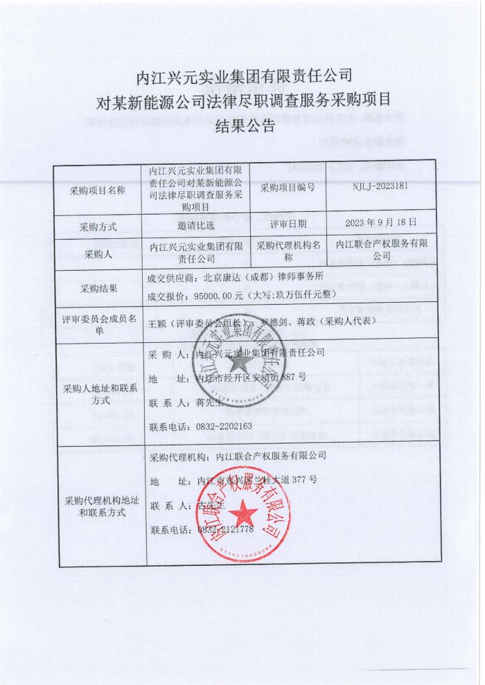 內(nèi)江興元實(shí)業(yè)集團(tuán)有限責(zé)任公司對(duì)某新能源公司法律盡職調(diào)查服務(wù)采購(gòu)項(xiàng)目結(jié)果公告