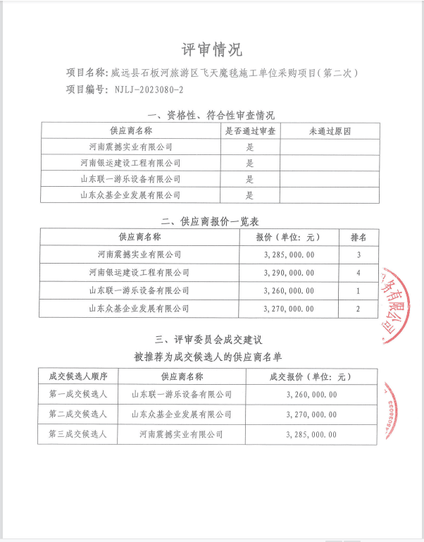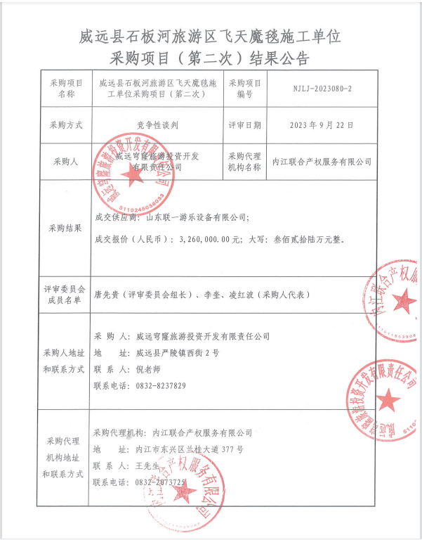 威遠縣石板河旅游區(qū)飛天魔毯施工單位采購項目(第二次)結(jié)果公告