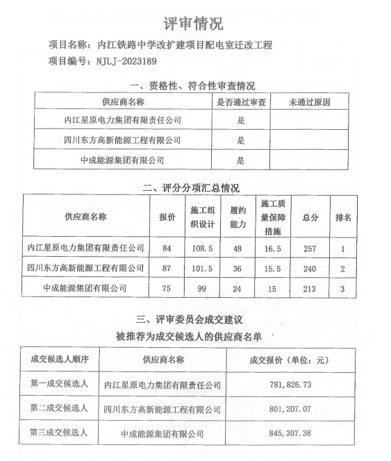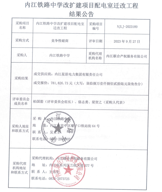 內(nèi)江鐵路中學(xué)改擴(kuò)建項(xiàng)目配電室遷改工程結(jié)果公告