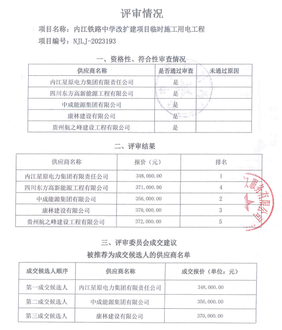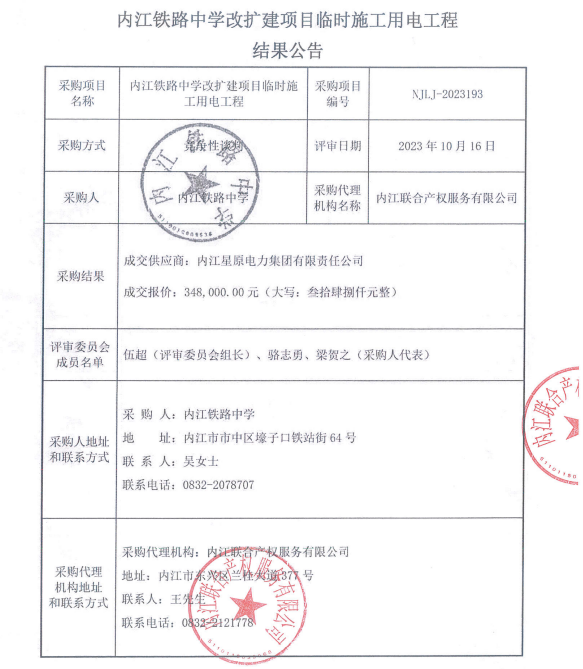 內(nèi)江鐵路中學改擴建項目臨時施工用電工程結(jié)果公告