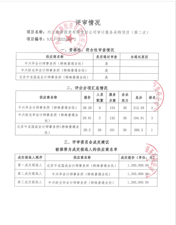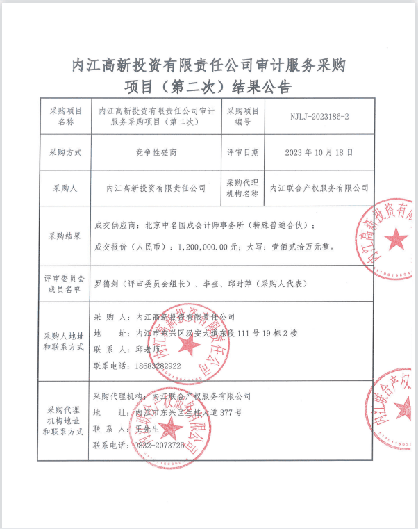 內(nèi)江高新投資有限責(zé)任公司審計服務(wù)采購項(xiàng)目(第二次)結(jié)果公告