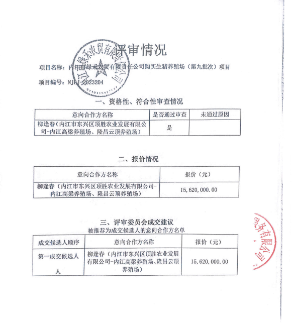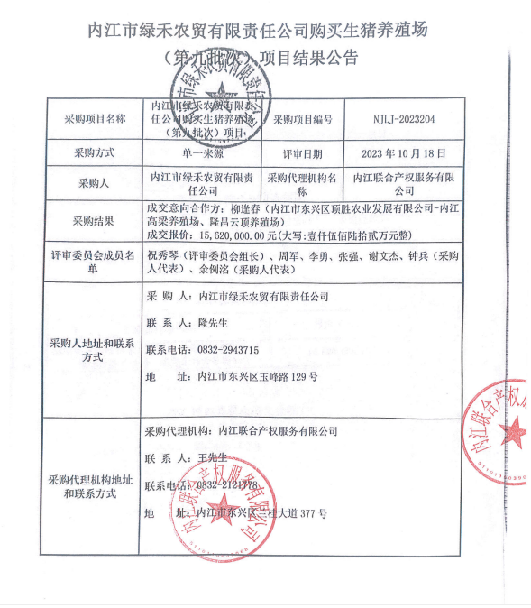 內(nèi)江市綠禾農(nóng)貿(mào)有限責(zé)任公司購買生豬養(yǎng)殖場(chǎng)(第九批次)項(xiàng)目結(jié)果公告