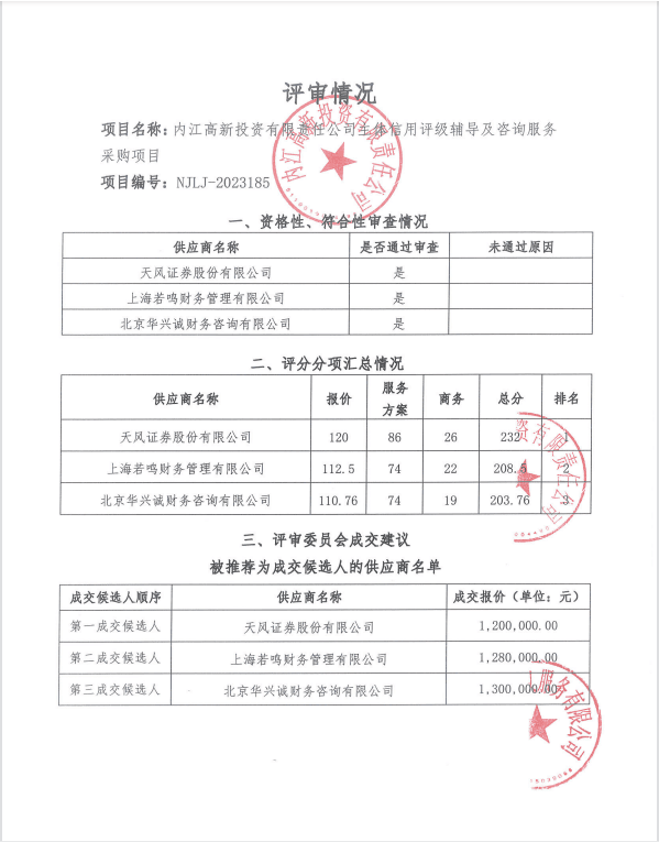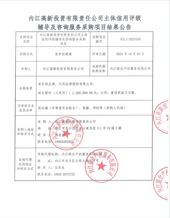 內(nèi)江高新投資有限責(zé)任公司主體信用評級輔導(dǎo)及咨詢服務(wù)采購項目結(jié)果公告