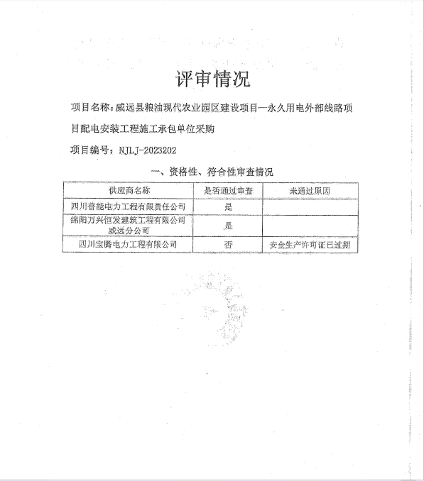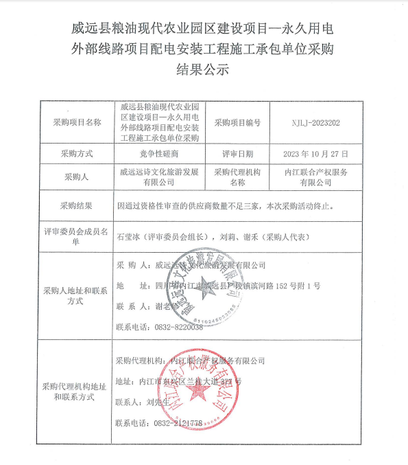 威遠縣糧油現(xiàn)代農(nóng)業(yè)園區(qū)建設項目—永久用電外部線路項目配電安裝工程施工承包單位采購結果公示