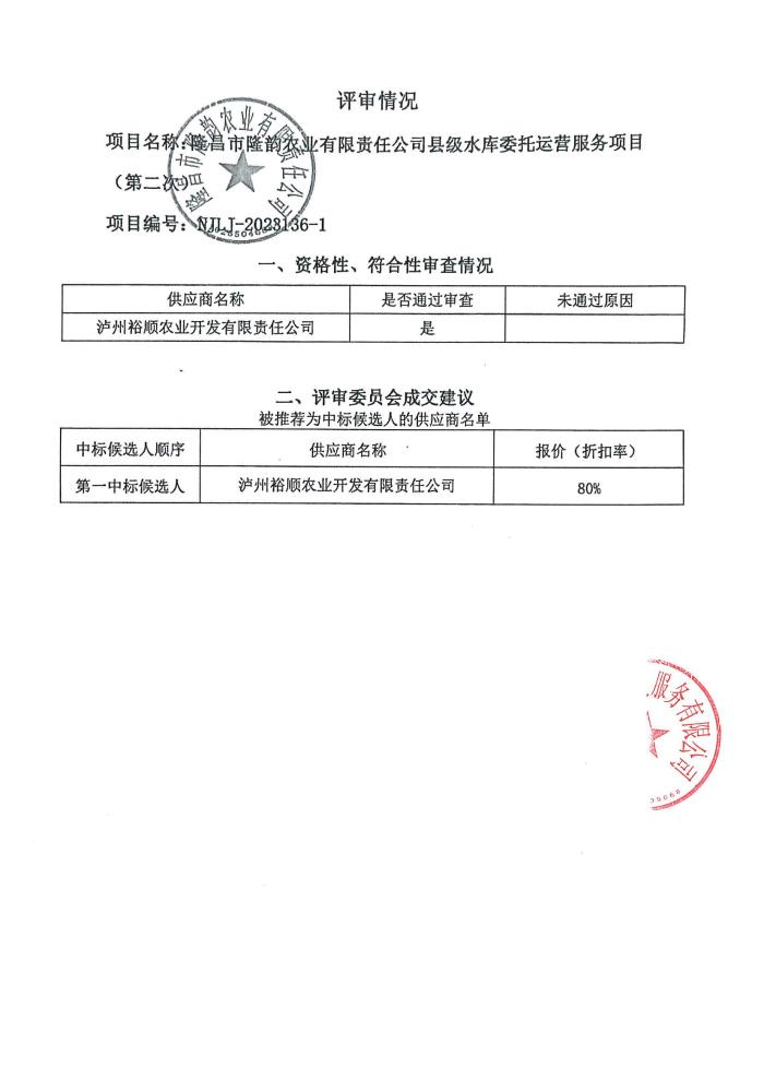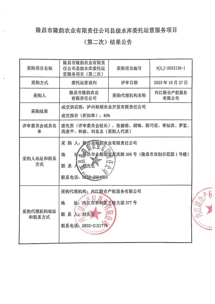 隆昌市隆韻農(nóng)業(yè)有限責(zé)任公司縣級(jí)水庫委托運(yùn)營服務(wù)項(xiàng)目(第二次)結(jié)果公告