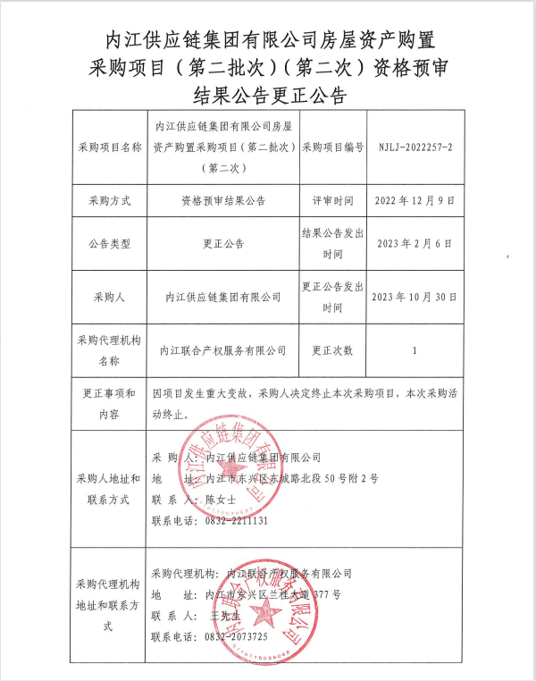 內(nèi)江供應(yīng)鏈集團有限公司房屋資產(chǎn)購置采購項目(第二批次)(第二次)資格預(yù)審結(jié)果公告更正公告