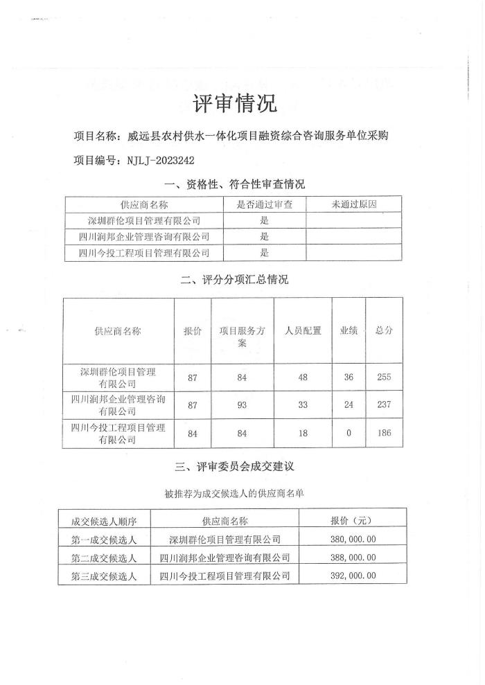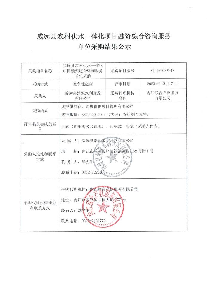 威遠縣農(nóng)村供水一體化項目融資綜合咨詢服務(wù)單位采購結(jié)果公示