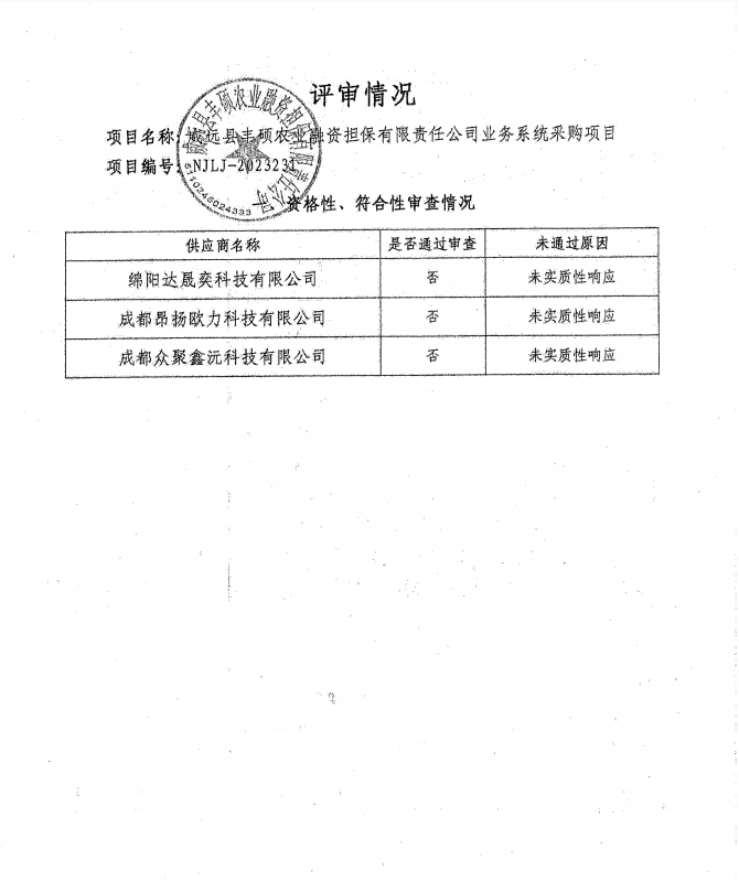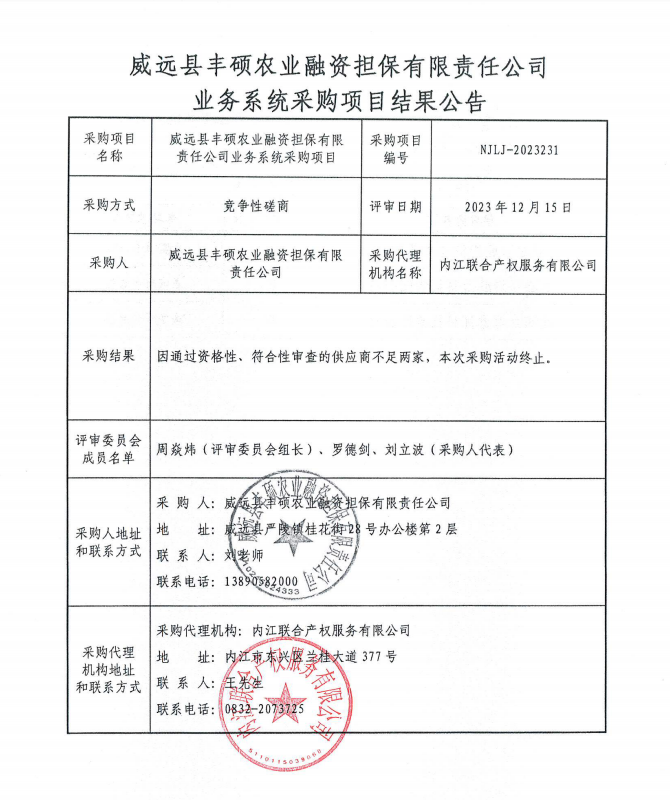 威遠(yuǎn)縣豐碩農(nóng)業(yè)融資擔(dān)保有限責(zé)任公司業(yè)務(wù)系統(tǒng)采購(gòu)項(xiàng)目結(jié)果公告