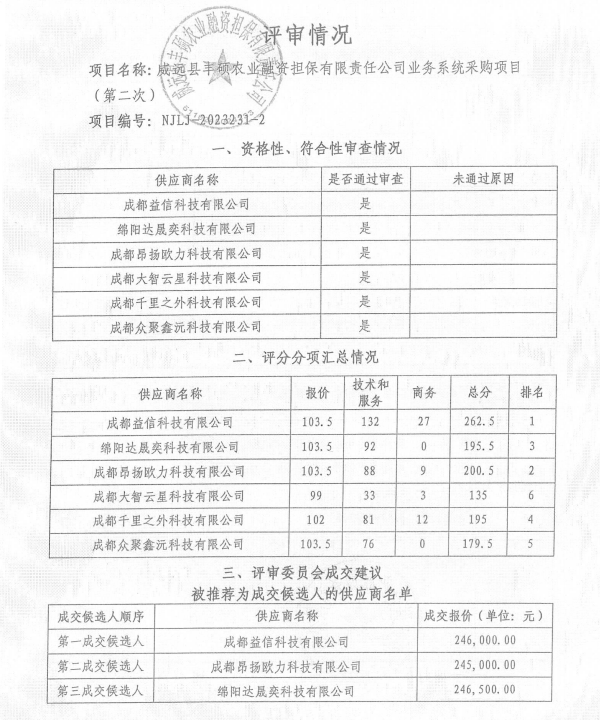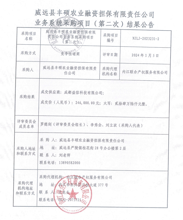 威遠縣豐碩農業(yè)融資擔保有限責任公司業(yè)務系統(tǒng)采購項目(第二次)結果公告