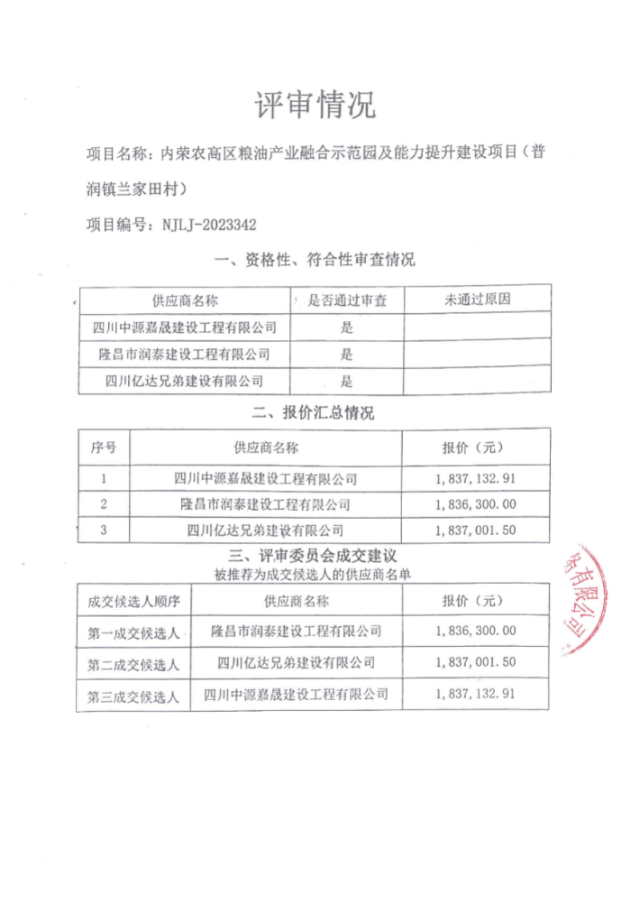 內(nèi)榮農(nóng)高區(qū)糧油產(chǎn)業(yè)融合示范園及能力提升建設(shè)項(xiàng)目(普潤(rùn)鎮(zhèn)蘭家田村)結(jié)果公告